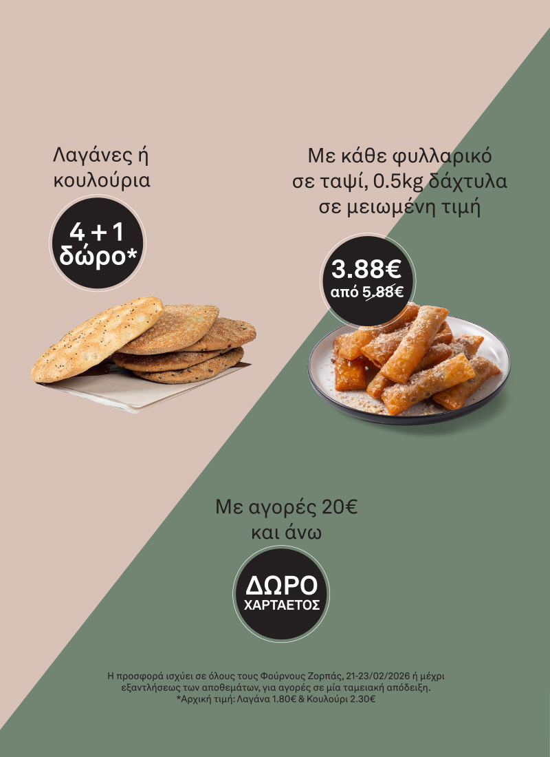 *Οι προσφορές ισχύουν σε όλους σε όλους τους Φούρνους ΖΟΡΠΑΣ, 21-23/02/2026 ή μέχρι εξαντλήσεως των αποθεμάτων, για αγορές σε μία ταμειακή απόδειξη.