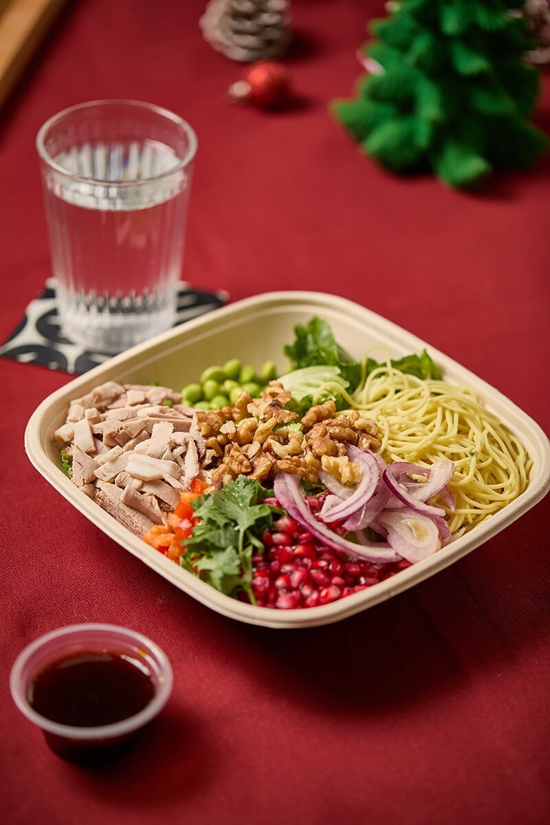 Α salad that combines roasted pork with noodles, teriyaki with honey sauce, pomegranate, edamame, red onion, red pepper, lettuce. A vibrant salad bursting with color, aroma, and flavours.