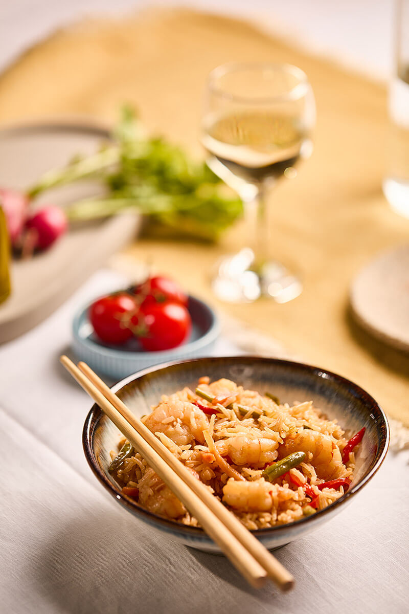 Ζουμερές γαρίδες όπου συνδυάζονται με τηγανητό ρύζι και λωρίδες από λαχανικά που συναντάμε στην ασιάτικη κουζίνα.